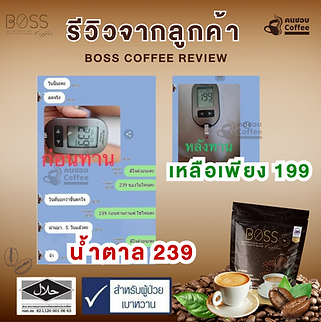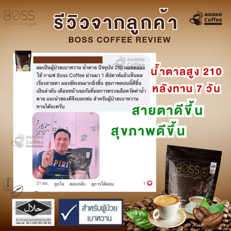 มีปัญหาสุขภาพเบาหวาน ความดัน มาเป็นเวลา 10 ปี รับการรักษาจากโรงพยาบาลและทานยามาโดยตลอด แต่เบาหวานและความดันก็ยังไม่ลด ได้ทานบอสคอฟฟี่ กาแฟช่วยลดน้ำตาลและความดัน ผลลัพธ์หลังการทาน อาการดีขึ้น และอาการปวดเข่าก็ดีขึ้น